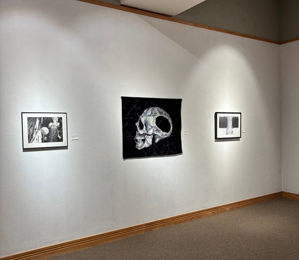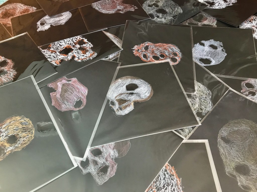 It is somewhat difficult to capture the flag works in still images. They benefit from being seen from different angles, and it isn’t obvious from the stills that they are meant to hang like flags. Untitled (“Then you will see the Deercat…”), 2024, Acrylic on velvet, 35″ x 44″Last year I made quite a few preparatory drawings for the trepanned flags. Nearly all were on black paper. This image shows a few of the 9″ x 12″ drawings. Many others were 12″ x 18″ or larger. Most were made with oil pastel pencil, with many incorporating colored pencil.Untitled (“The Most Dangerous Road in the World”) on exhibit in 2023 at the Fullerton Museum.