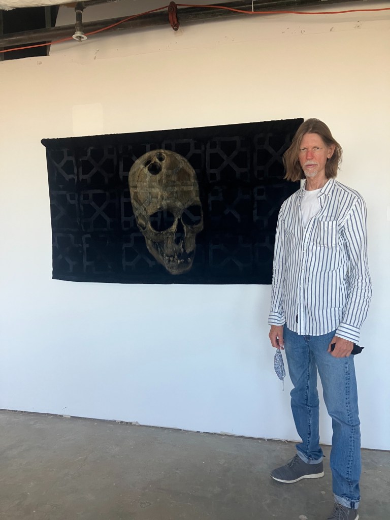 The latest…Currently on view in Fullerton through the end of May (just the artwork, I won’t be standing there the whole time), Untitled (“But the dream did not please the god.”), 2024, Acrylic on embossed velvet, 39.5” x 64”.NOMAD III at Del Amo Crossing, organized by the Torrance Art Museum, August, 2024. Showing Untitled (“Soul Killer”), 2024, Acrylic on embossed velvet, 39.5” x 64”. The first of the larger scale flags.Untitled (“Never Used the Same Door Twice”), 2023, Acrylic on embossed velvet, 35” x 43” at the Deines Cultural Center, Russell, KS.