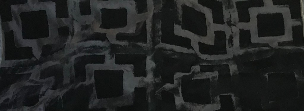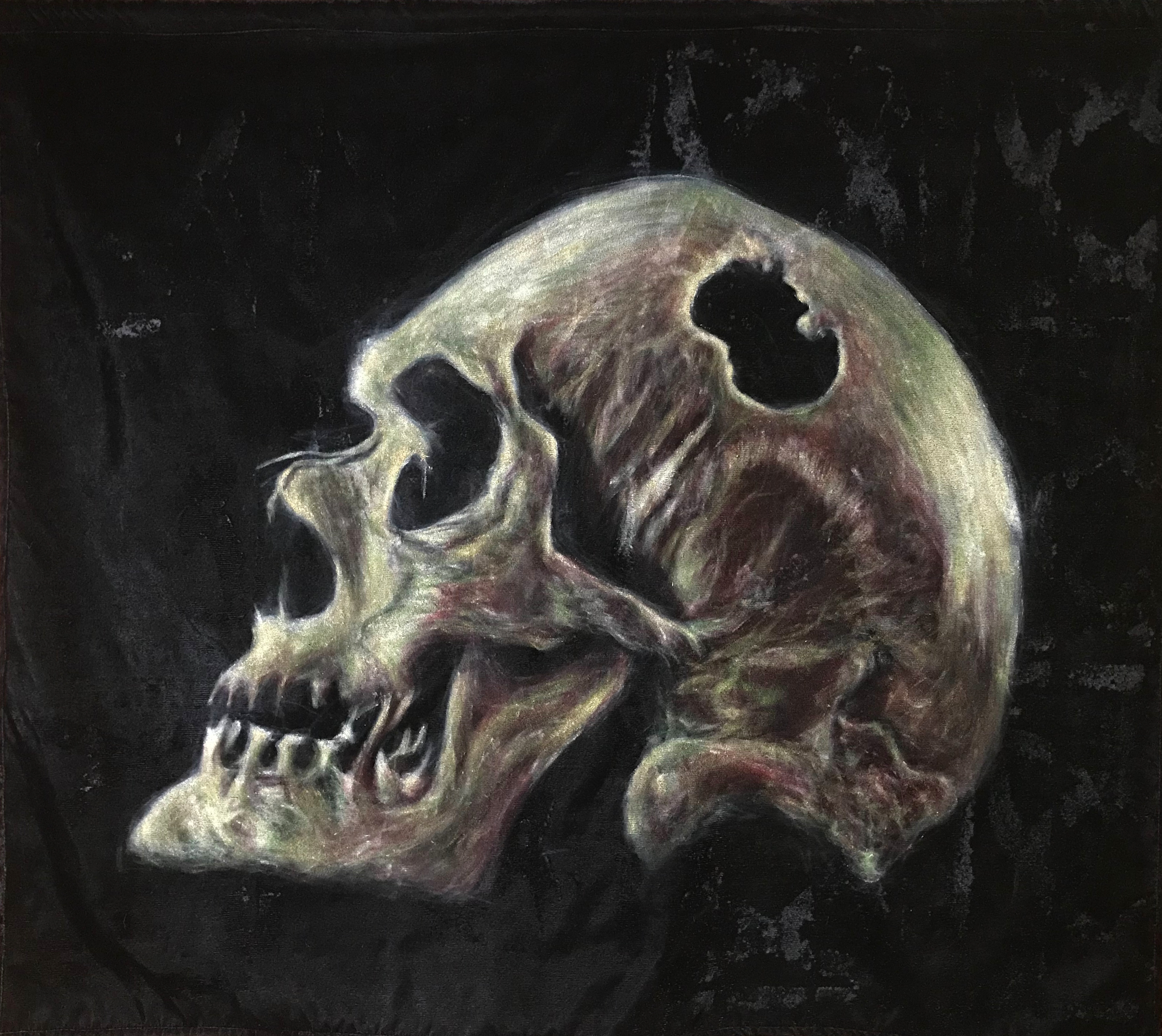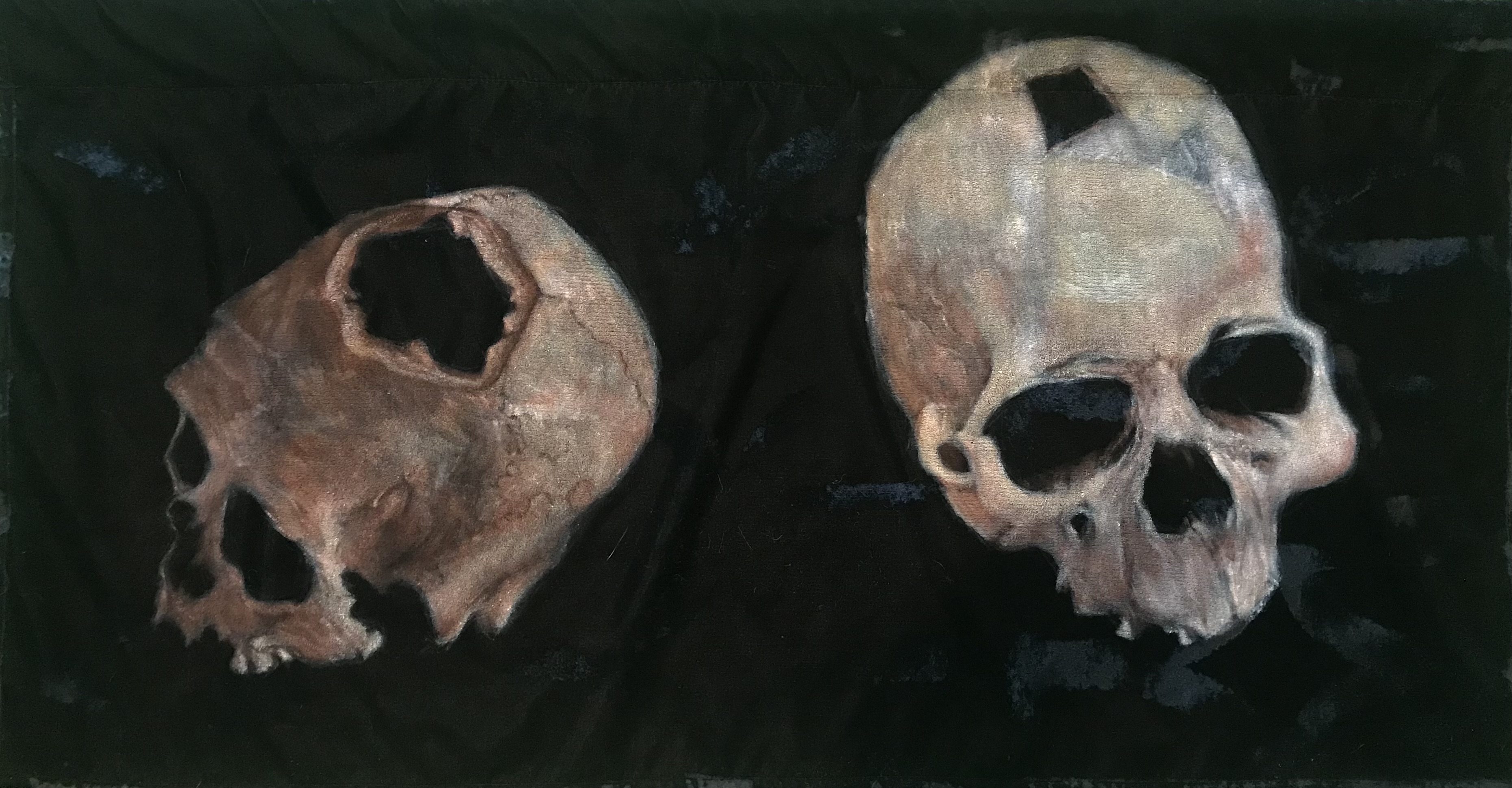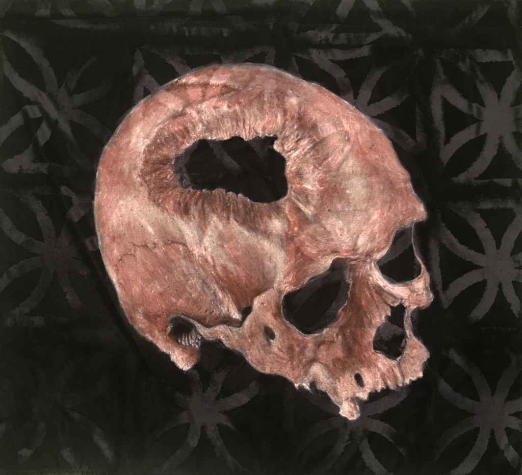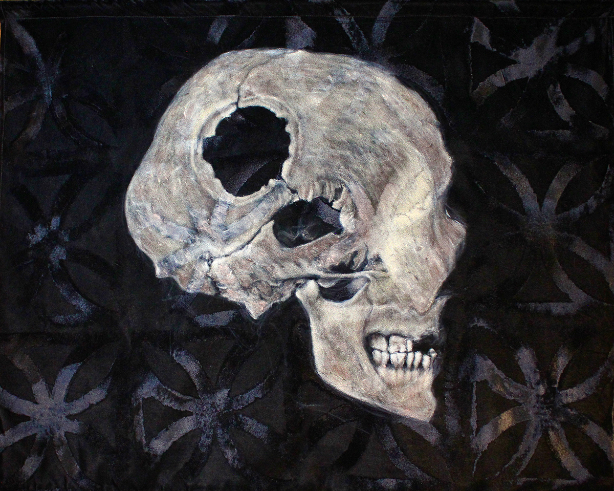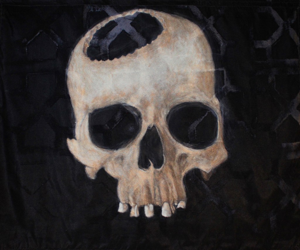 The works on this page are from an ongoing series combining patterns of concrete vista blocks developed for midcentury architecture with images of trepanned skulls discovered in the remains of ancient civilizations. The skulls are painted in acrylic on black velvet fabric hand embossed directly from concrete vista blocks. They are un-stretched, and conceived to hang unframed like flags.