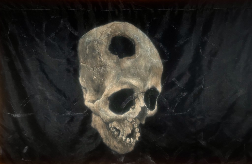 The use of black velvet is meant to be reminiscent of a romanticized theme park or Hollywood film version of a Jolly Roger pirate flag while also recalling the tradition of kitsch velvet paintings of entertainment figures, clowns, and other subjects.